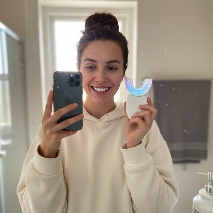 The BeamSmile One cleans all your teeth at the same time using gentle vibrations and a soft silicone mouthpiece. It reaches places a regular toothbrush often misses, without hurting your gums.